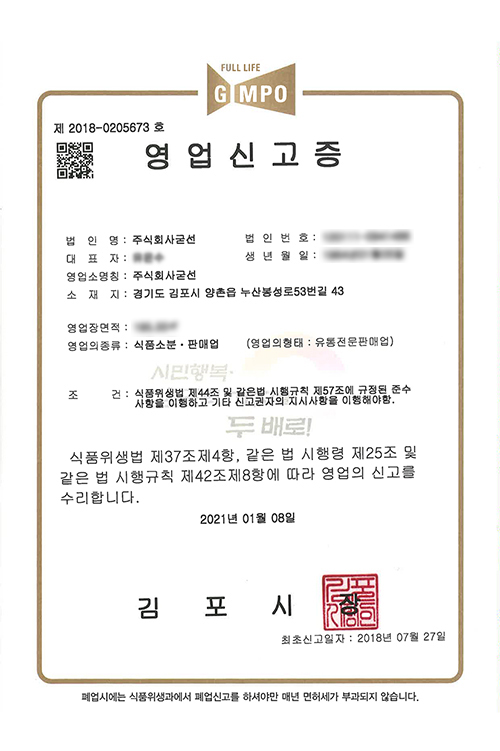 영업신고증(유통전문판매업)